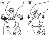 (A)あけ方:キャップを手前にひねります。(容器の中心を押さえたまま開封すると薬液がとびだすことがありますので、