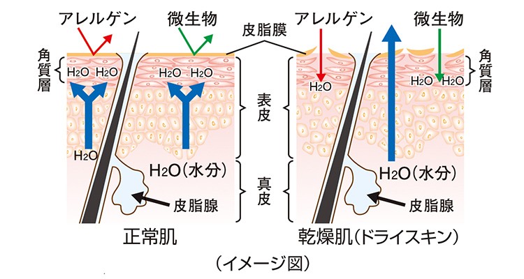 ところが、「入浴の際にタオルでゴシゴシとこする」、あるいは「石鹸やボディソープで一日に何度も洗う」などの日々の習慣が角質層や皮脂膜のコーティングに亀裂を生じさせ、そこから皮膚の水分が失われていきます。その他、紫外線やエアコンの影響によって、皮膚の乾燥が進んでしまうこともあります。