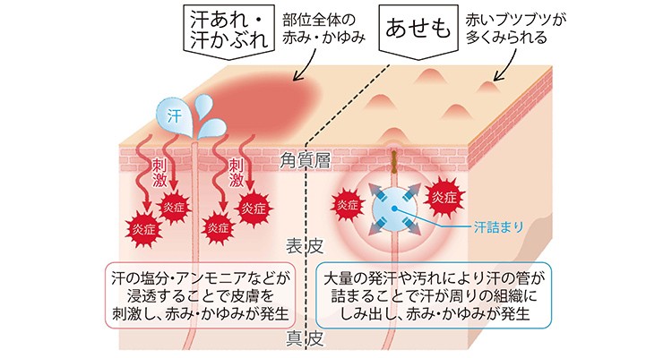 一方、汗かぶれは、汗に含まれる塩分やアンモニアが刺激となって皮膚がかぶれた状態です。「汗あれ」と呼ぶこともあります。発汗するたびに、皮膚が刺激され、ヒリヒリ・チクチクとした痛みを伴うこともあります。