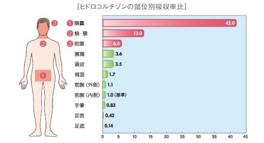 ステロイド外用剤の皮膚への吸収率は年齢による違いだけでなく、使用する部位によっても異なります。表②は腕の皮膚へのステロイド外用剤の吸収率を1とした時の、健康な皮膚の部位別吸収率の差を示した図です。皮膚が薄くデリケートな部位は吸収率が高く、皮膚が厚い部位は吸収率が低くなっています。