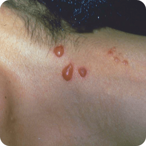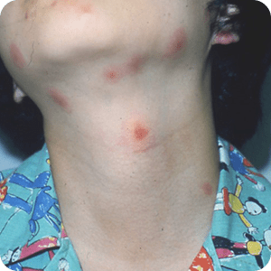 ブユによる虫刺され症状の特徴は、刺されている時の自覚症状が少なく、刺されてから半日~翌日以降に強い腫れとかゆみが出ることです。また、皮膚をかじって吸血した痕が、点状の出血や内出血として残ることがあります。