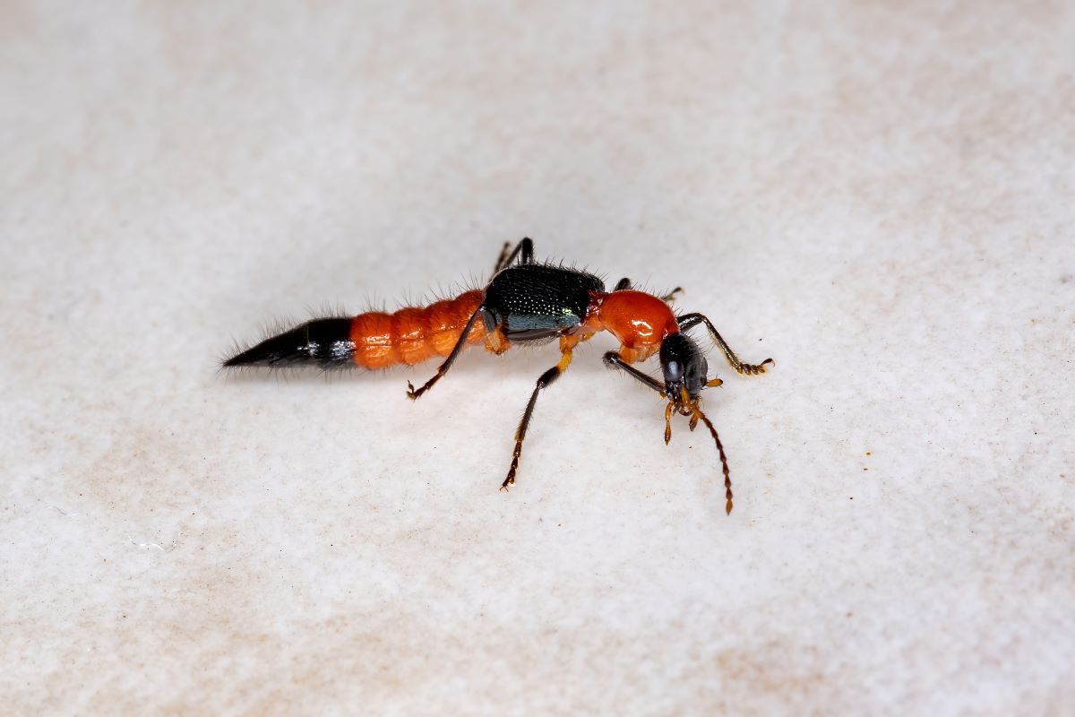 「やけど虫」とは、正式には「アオバアリガタハネカクシ」という名前の甲虫(こうちゅう)の俗称です。- 体長7mm程度のとても小さい虫です。頭・後胸・腹・背面・羽が黒色、前胸と中胸がオレンジ色というツートンカラーの特徴的な姿をしています。