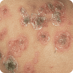とびひには、水膨れが目立つ「水疱性膿痂疹(すいほうせいのうかしん)」と、カサブタが目立つ「痂皮性膿痂疹(かひせいのうかしん)」の2つの種類があります。