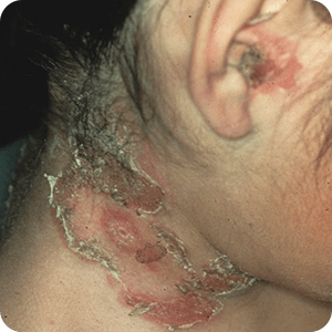 感染したところに水ぶくれやびらんが発生し、浸出液が固まってかさぶたができます。感染力が強く、患部に触れた手でほかの部位を引っ掻くと菌がうつって侵入し、火事の「飛び火」のように別の部位に症状が広がることから「とびひ」と呼ばれています。「伝染性」という名の通り、手指を介した接触などによって他人に感染することがあります。
