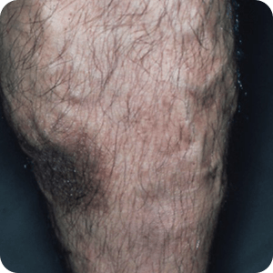静脈瘤の病気が進行すると、皮膚に色がついてしまったり(色素沈着)、足のくるぶしの上のところの皮膚が炎症を起こしたり(静脈うっ滞性皮膚炎)、重症の場合は皮膚に欠損(潰瘍)を形成してしまう(うっ滞性潰瘍)ため注意が必要です。