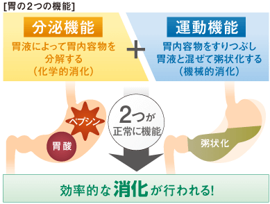 胃は「分泌」と「運動」の2つの機能によって食べ物を消化していますが、これらの機能調節には自律神経が関係しています。