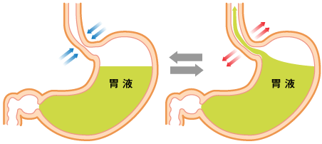 健康な人でも逆流は起こりますが、その頻度は少ないです。そのため、食道のぜん動運動や、唾液を飲み込むことによって速やかに胃に戻すことができ、症状が現れることはありません。しかし、括約筋が緩みやすくなると、胃酸を含んだ胃内容物が頻繁に逆流し、長時間に亘って食道粘膜が刺激されることで症状が現れます。