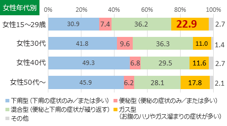 • 女性は男性に比べ、下痢と便秘を繰り返す混合型が多くなっています。