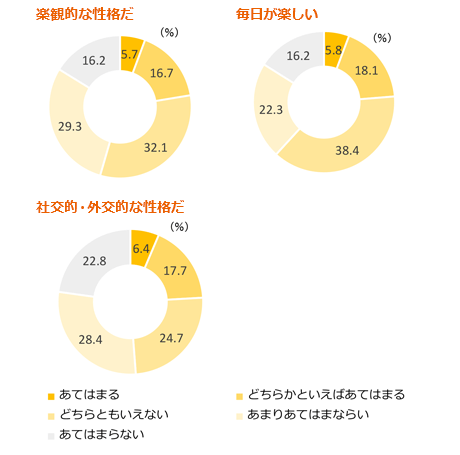 • IBSを抱える人は、ストレスをあまり感じることなく、物事を楽観的にとらえ、社交性に富み、毎日を楽しく過ごしている、といった傾向が低いようです。