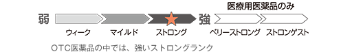 外用として開発されたストロングランクの外用ステロイド (合成副腎皮質ホルモン)です。優れた抗炎症作用により、赤み、腫れ、かゆみを抑えます。 外用ステロイドの効果の強さは医療用医薬品を含めて5段階に分類されていますが、OTC医薬品としては「ウィーク」「マイルド」「ストロング」の3段階が市販されています。フルオシノロンアセトニドは「ストロング」に分類されます。