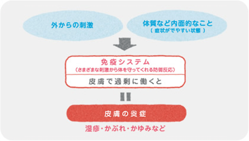湿疹・皮膚炎は、外からの刺激と体質などの内面的なことが影響しあって起こる炎症性の皮膚疾患です。