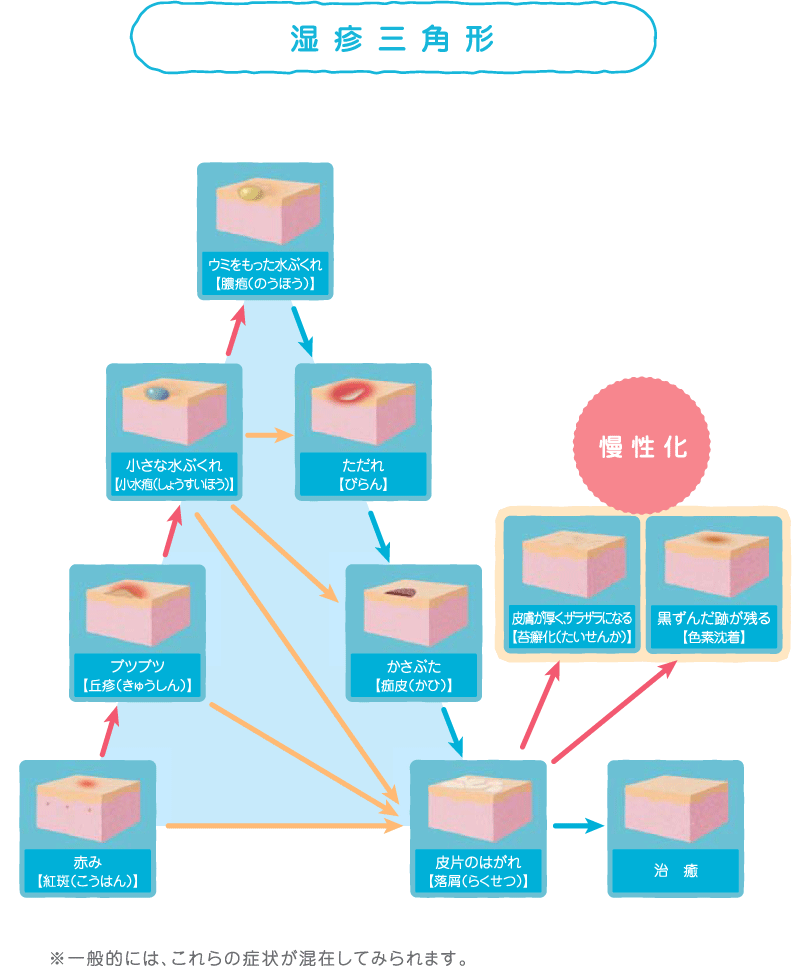 また、湿疹・皮膚炎は発症から治るまでに、「湿疹三角」と呼ばれる経路をたどるとされています。