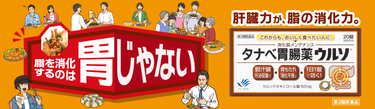 ![[まとめ]脂肪による胃もたれを防ぐポイントは肝臓力です。とはいえ、加齢による肝臓機能の低下は食い止められるものではありません。胃のもたれや食欲不振で悩んでいる方は、胆汁酸そのものとしても機能し、かつ肝臓に作用して胆汁酸の分泌を促してくれるウルソデオキシコール酸(UDCA)にも目を向けてみてはいかがでしょうか。](../../assets/images/column/02/txt_column02_summary_sp.png)