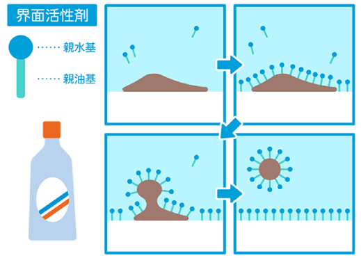 例として水と油を思い浮かべると分かりやすいでしょう。同じ容器に入れても、水と油は溶けずに分離したままです。しかし洗剤などを使用すると、水と混ざるようになって油汚れが落としやすくなります。胆汁酸には、この界面活性作用があるのです。
