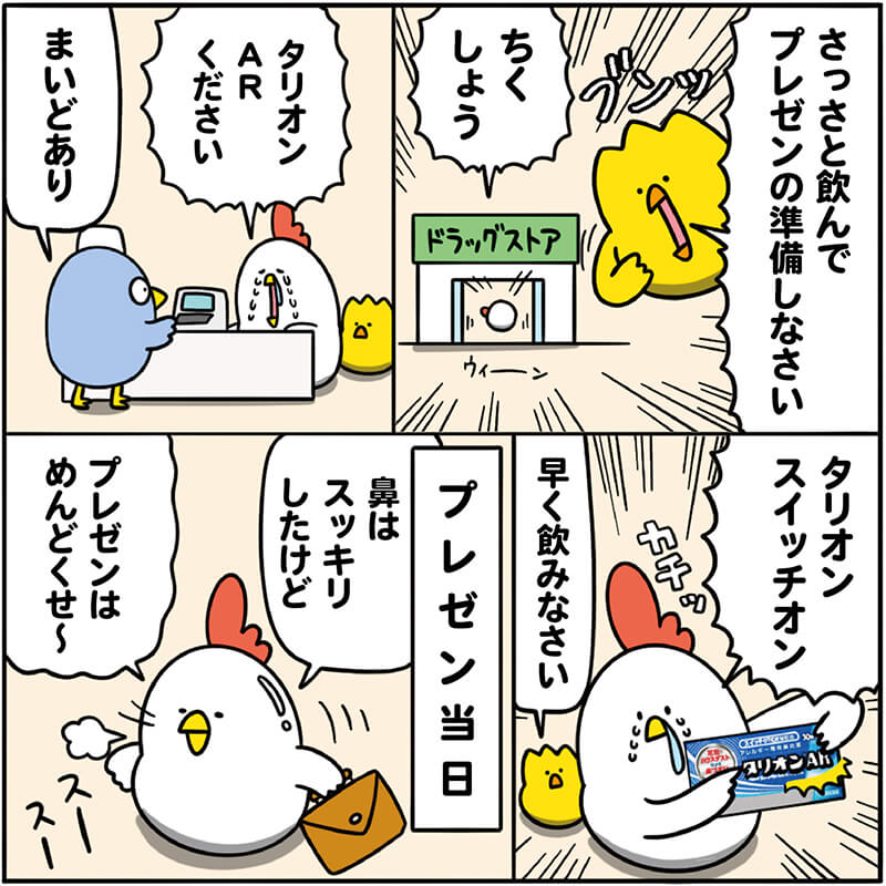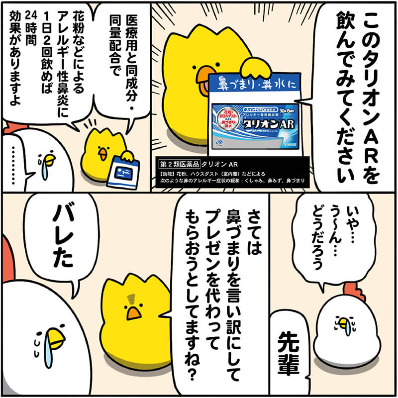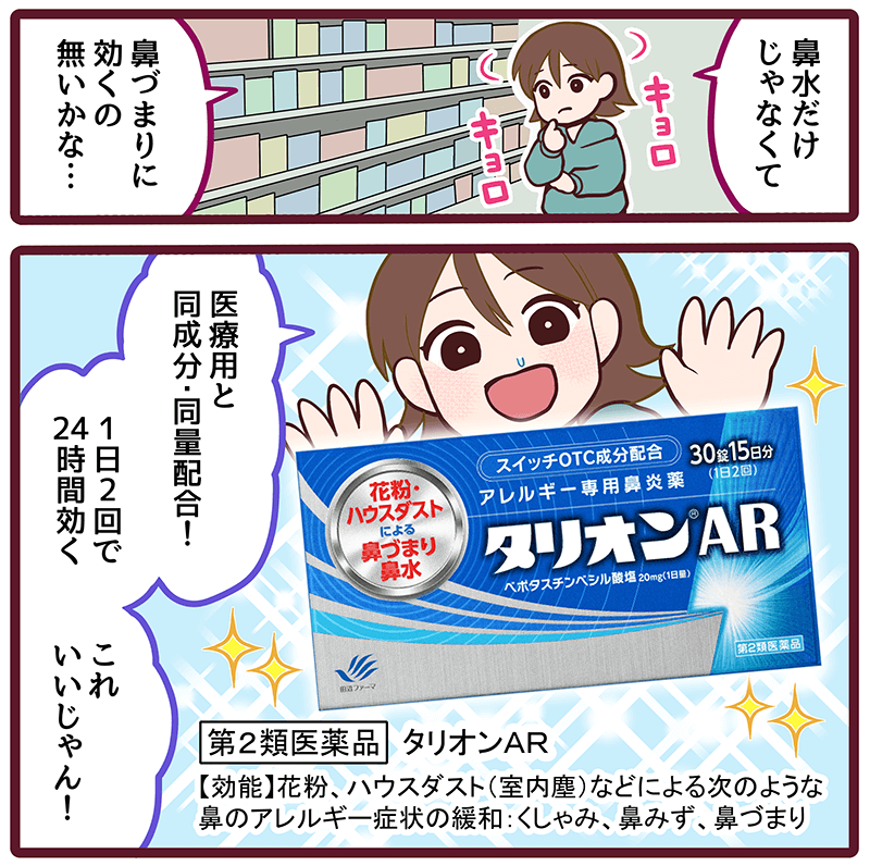 タリオンARを服用している間は、点眼薬や点鼻薬はお使いいただけます。ただし他にアレルギー用薬(鼻炎用内服薬、皮膚疾患用薬を含む)、抗ヒスタミン剤を含有する内服薬等(かぜ薬、せき止め・去たん薬、乗物酔い薬、催眠鎮静薬等)のお薬は使用しないでください
