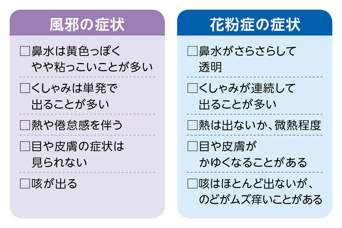 「春は過ぎたのに、まだ鼻水やくしゃみが止まらない……」「夏の終わりごろから、毎年必ず鼻炎が悪化する」といった人はいないでしょうか。毎年決まって症状が出るという人は、秋の花粉症かもしれません。症状がよく似ているので風邪と間違われがちですが、花粉症には次のような特徴があります。